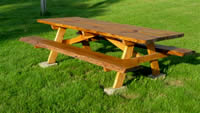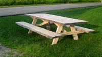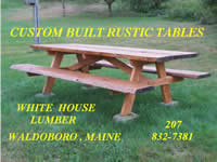 custom cut, full dimension rough cut lumber. A 2x4 is a 2x4... We will cut any softwood up to 20 inches wide and 20 feet long, to the 1/4 inch.. If we can get it in the mill,, we will cut it,,, We also offer surface planning to 25 inches... No job too small or too big. We will work with you on any project, from the small garden shed to the house of your dreams, right down to the picket fence, we do decks and docks too,, If timber frame is your dream, all we need is a cut list,, We specialize in wide pine, for flooring, or, thick live edge for counter and bar tops. We now offer Live Edge Rustic Picnic Tables, in a wide variety of sizes. In most cases the tops, (which are bookmatched), and the benches, are from the same log. Tables are strongly supported by a lagbolted Hemlock Frame. In the eventuality, that a part should fail, it can easily be replaced. Tables are sold unfinished, however for an additional fee, we can seal them with a coat of Australian Timber Oil. Prices range from $200 and up. Our Deluxe table, has a top as wide as 40 inches, and 8 feet long. Our Super Deluxe model is 16 feet. Have something different in mind, let us know.. Contact us by phone or e-mail.. You design it,, We will cut it,,, If it's done here,, It's done "Zachlie Right" Zach T.White, Jr. Owner and Sawyer